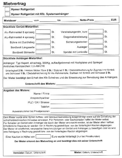 Damit auch alles seine Richtigkeit hat wird ein Vertrag abgeschlossen.Darin werden die gemieteten Teile sowie Dauer und Preis festgelegt.
